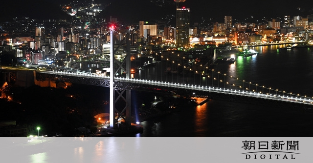 本州と九州をつなぐ関門橋が14日に、開通から50年を迎える。全長1068メートルのつり橋は当時「東洋一」とうたわれ、物や人の流れを支えてきた。12日からライトアップの照明が30年ぶりにリニューアルされ、高さ約140メートルの主塔2本がLEDの明かりに照らし出されている。