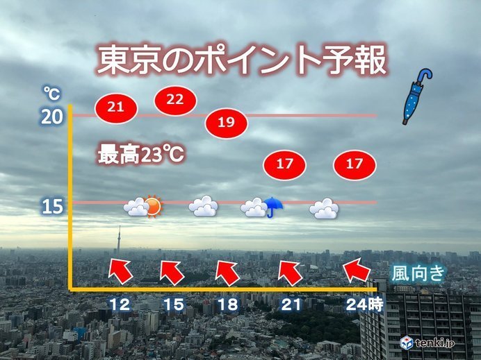 けさの東京都心は、最低気温が14度5分。4日連続で平年を下回りました。日中の気温は、お昼前後に20度を超えますが、夜は20度を下回って、ひんやりとした空気になるでしょう。