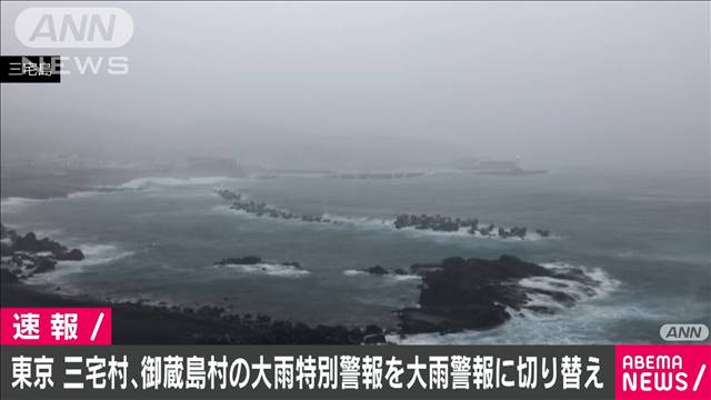 気象庁は東京の三宅村と御蔵島村に出していた大雨特別警報を大雨警報に切り替えました。 気象庁は10日午後5時に東京の三宅村と御蔵島村に大雨特別警報を出していましたが、大雨警報に切り替えました。雨がやんでも河川に水が流れ込んだり水を含んだ斜面が崩落したりすることもあるため、引き続き厳重に警戒してください。
