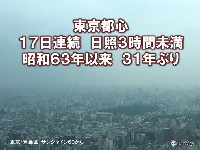 東京都心はきょう(13日)午後3時までの日照時間は11分で、17日連続で日照が3時間未満となりそうです。17日間も続くのは1988年(昭和63年)以来、31年ぶりです。