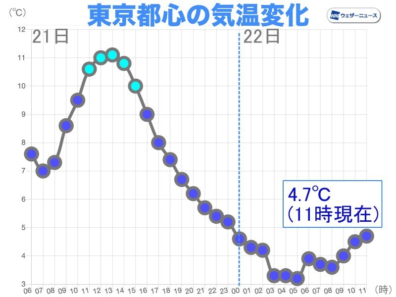 東京都心では午前11時の気温が4.7℃と、朝から3℃足らずしか上がっておらず、このあとも日差しがほとんどないため、最高気温は7℃の予想です。
