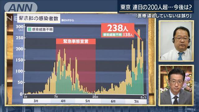 堀教授:「大阪の感染の拡大状況が、東京と大変似てきました。これまでの過去最高を更新、重症病床にはまだ余裕があるものの油断は禁物である点が共通しています。大阪は『GoToトラベル』キャンペーンの対象地域ですから、今後は、さらなる増加が見込まれてきます。ただし、東京都とは違って、夜の街を中心にガイドラインに準拠していない店舗に対して、休業を要請していくと、ピンポイントでの対策方針、メリハリをつけて明言しています。これが東京と大阪の違いです」 東京都でも、感染の再拡大が止まりません。22日は238人と2日連続で200人を超えました。