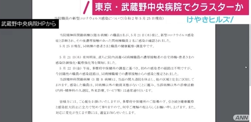 小金井市の「武蔵野中央病院」では、今月21日に精神科閉鎖病棟の職員1人が新型コロナウイルスに感染したことが確認された。その後、同じ病棟に勤務する職員2人も感染が確認された。都によると、他にもこの病棟の患者や職員の合わせて18人が発熱などの症状を訴えており、順番にPCR検査を行っているという。