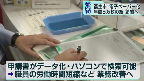 東京・福生市が「電子ペーパーでの申請」をスタートし、東京都内で初めてペーパーレス化に向けた取り組みを始めました。 福生市はこれまで、用紙に必要事項を書いて申請していましたが、これからはタブレット画面に専用のペンで申請者の氏名を書くことになります。担当者によりますとこの取り組みは都内では初めてで、大規模な紙資源の節約を目指しています。また、申請書がデータ化されることでパソコンで検索ができるようになり、職員の労働時間の短縮など業務改善の効果も狙っています。 申請書を電子ペーパー化するのは住民票の写しや印鑑登録証明書などで、今後は他のサービスについても電子化を検討していく方針です。