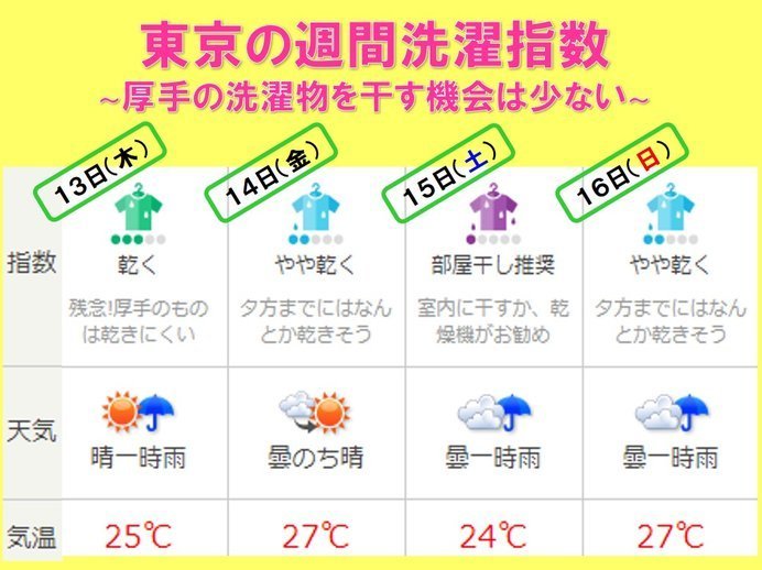 東京都心ではこの先、梅雨の晴れ間はあるものの、ジメジメ、ムシムシで絶好の洗濯日和といえる日は少ない見通しです。