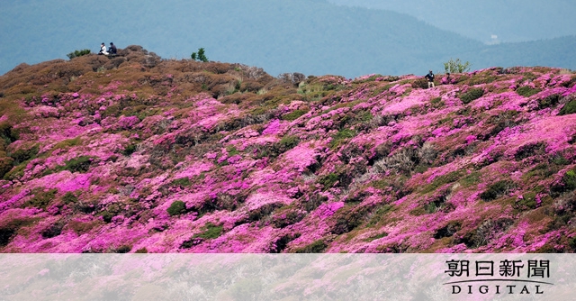梅雨の晴れ間が広がった7日、ミヤマキリシマが見頃を迎えた大分県のくじゅう連山には、多くの登山客が詰めかけていた。平治岳や北大船山などでは、辺り一面にピンク色の花が咲き誇り、山肌を鮮やかに彩っていた。