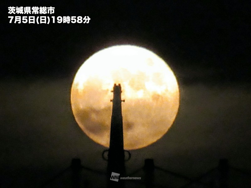 今日5日(日)13時44分頃に満月の瞬間を迎えた月が各地で見えています。 梅雨前線の影響で広範囲で雲が広がっていますが、雲越しにまんまるのお月様を楽しめている地域もあるようです。