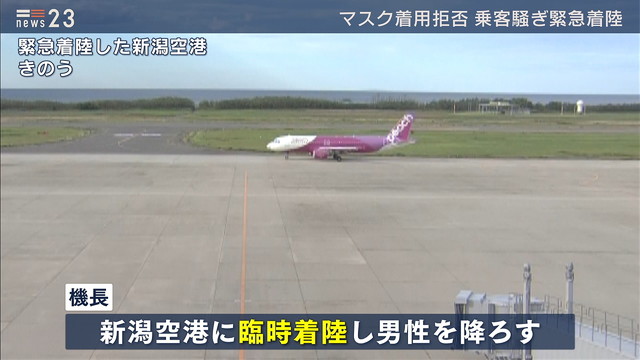 7日、北海道から大阪に向かっていたピーチ・アビエーションの機内で乗客の男性がマスクの着用要請を拒否し、乗務員や乗客を威嚇したとして新潟空港に臨時着陸していたことが分かりました。 ピーチ・アビエーションによりますと、7日、釧路空港発関西空港行き機内で乗客の男性がマスクの着用を拒否したことから、男性の周りに座っていた客を移動させるなどして出発しました。しかし、男性が上空で大声を上げるなどして乗客や乗務員を威嚇しマスクの着用を拒否し続けたため、機長が安全な運航を阻害する行為と判断し新潟空港に臨時着陸し男性を降ろしたということです。機内には125人の乗客がいて2時間15分遅れで関西空港に到着しました。国交省によりますとマスクの着用を発端とするトラブルで臨時着陸するのは初めてだということです。