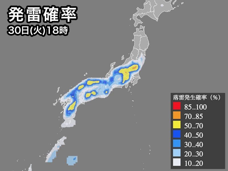 午後の発雷確率を見ると、西日本から東日本の山沿いで50%以上の黄色のエリアが広がっています。