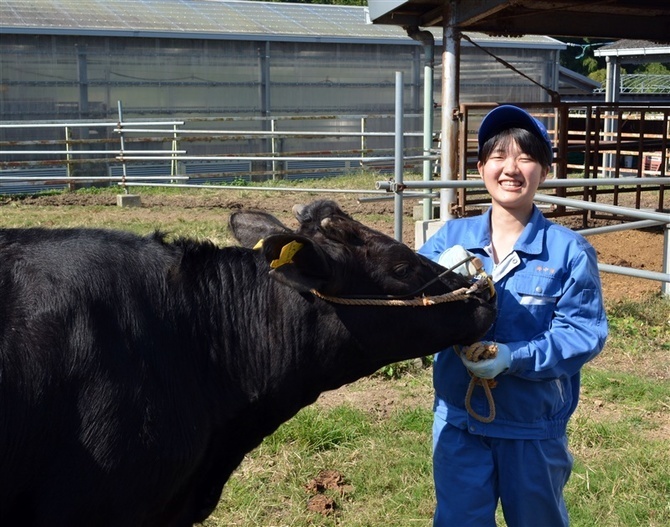 授業では牛の飼育や調教をしている野中さん。「知識があると動物を見るポイントが増え、小さな異変にも気づくようになった」と話し、現在は来年の全国大会出場を目指す後輩たちに勉強を教えている。