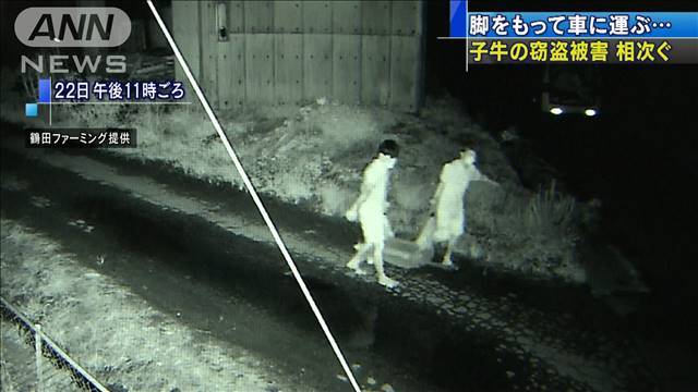 栃木県足利市では牧場の牛舎から子牛が盗まれる被害が相次いでいます。防犯カメラには子牛を運ぶ不審な3人組の姿が映っていました。 これは足利市内の牧場に設置された防犯カメラの映像です。3人組が子牛の脚をつかみ、車に運び入れています。23日の朝、牧場の経営者が牛舎から3頭の子牛が盗まれたことに気付いて警察に通報しました。