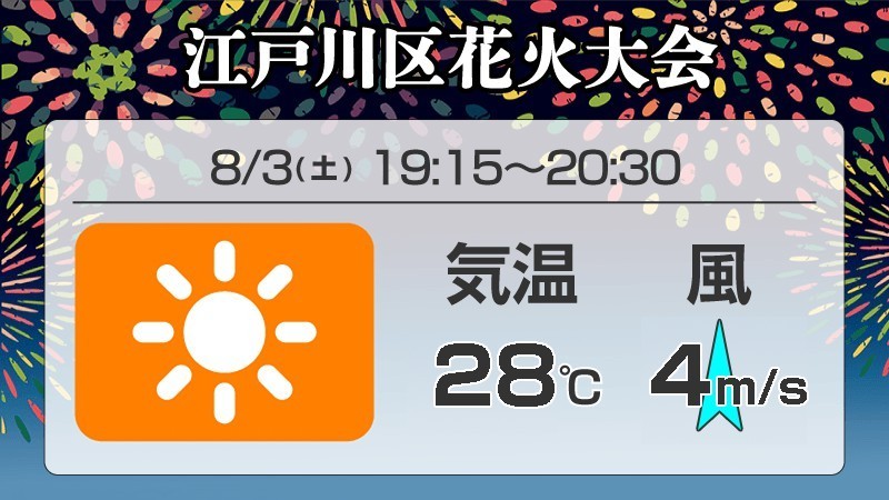 地上付近の風向きは南風の予想です。花火の煙は北側に流れるので、花火鑑賞には風下にあたる瑞江駅や篠崎駅方面からがオススメです。