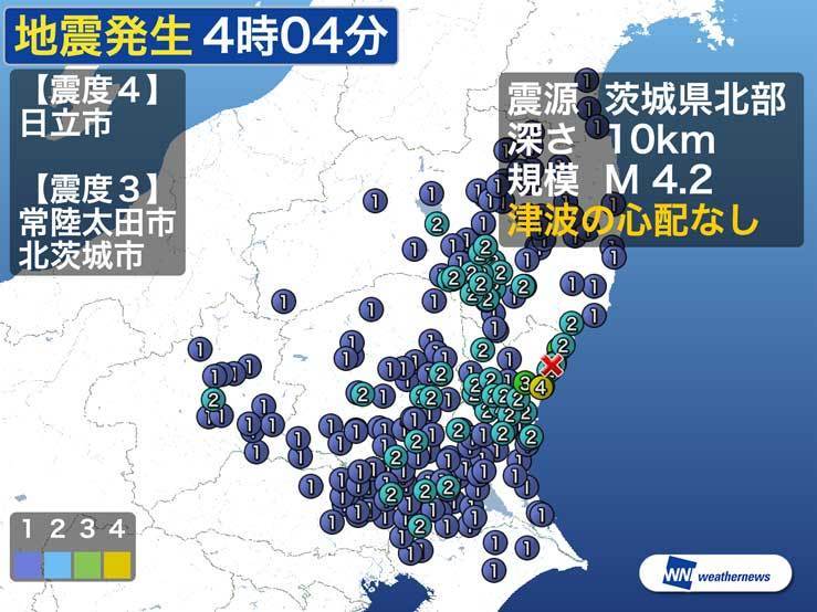 震源地は茨城県北部で、震源の深さは約10km、地震の規模(マグニチュード)は4.2と推定されます。