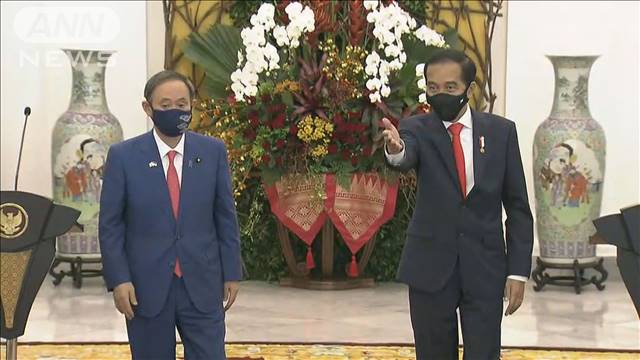 菅総理大臣がインドネシアの大統領と会談。新型コロナウイルスの感染対策で異例の対応 20日午後に行われた首脳会談では、菅総理もジョコ大統領もマスクを着用しました。インドネシアは新型コロナの感染者数が東南アジア最多ということで、テーブルの中央には大きなアクリル板も設置され、インドネシア側にはフェースシールドで徹底防御している参加者も見られました。メインテーマは安全保障での連携強化です。日本との外務・防衛閣僚会議を早期に実施することを確認したほか、日本からの防衛装備品の輸出に向けた協議も行いました。いずれも中国を念頭に置いた対応で、日本としてはインド洋と太平洋の要に位置するインドネシアとの連携を強化することで中国の南シナ海への進出を牽制(けんせい)する狙いがあります。