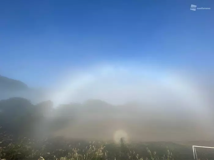 今朝は晴れて風が弱かったため、放射冷却現象が強まり冷え込みました。写真が撮影された長野県白馬村では、最低気温が7.8℃と今シーズン一番の冷え込みとなっています。この冷え込みにより霧が発生し、タイミング良く差し込んだ朝日が白虹とブロッケン現象を起こしました。 今日このあとはスッキリと晴れて穏やかな秋晴れとなります。霧も解消に向かう見込みです。昼間と朝晩の気温差が大きくなるので体調管理にお気を付けください。