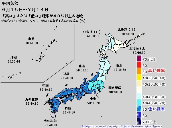 週ごとの予報によると、1週目(6/15~21)は、北・東日本では低気圧の影響で平年と同様に曇りや雨の日が多いが、西日本は前線の影響を受けにくく、平年に比べ曇りや雨の日が少ない見通し。