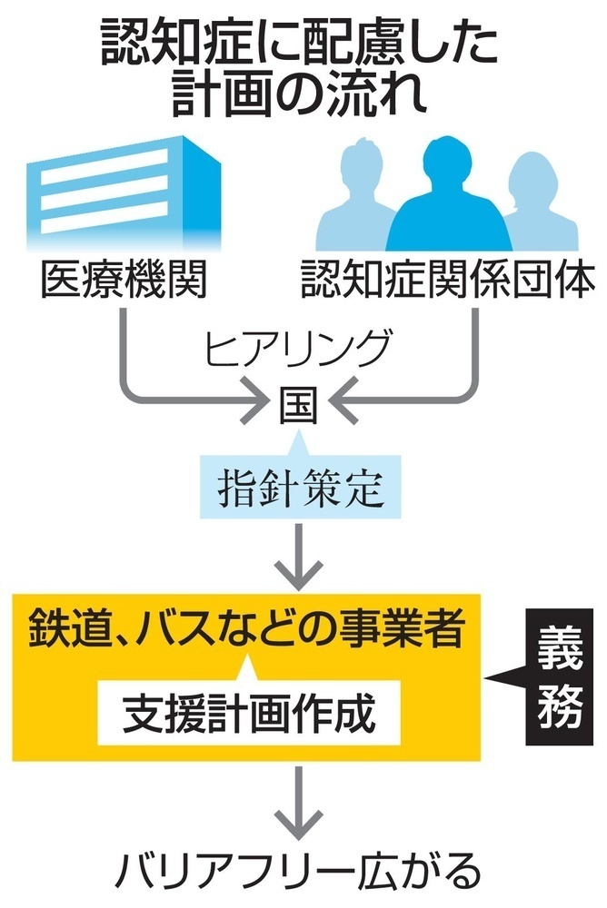 認知症対策を強化するため、政府は鉄道やバス、航空会社に、物忘れなど特有の悩みを抱える認知症の利用者が困らないよう配慮する支援計画の作成を初めて義務付ける。怠った場合は50万円以下の罰金を科す。2021年をめどに実施する。日常生活で不便に感じる障壁を減らす取り組み「認知症バリアフリー」の目玉政策として、来週にも策定する新たな認知症対策の大綱に盛り込む。政府関係者が13日、明らかにした。