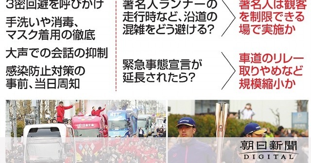 4月5、6日予定の愛知県も宣言が出ている。昨年末からランナーに辞退者が出始めた。県の担当者は「県民に喜んでもらえればいいが、そうはいかない状況にどんどんなっている」と危機感を募らせる。