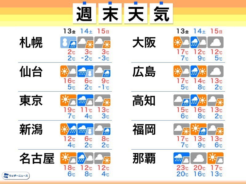 今日12日(木)は全国的に晴れて春らしい陽気になっていますが、明日13日(金)以降は再び西から天気下り坂です。