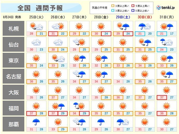 台風8号が持ち込む熱帯由来の暖かい空気も要因となり、西日本を中心に最高気温が35度以上の猛暑日になる所もあるでしょう。27日(木)頃までは、猛烈な暑さに加えて天気の急変にも気をつけて下さい。 九州から関東は、週末に再び猛暑のピークがありそうです。日中は強い日差しが照り付け、気温が上昇。大阪など37度くらいまで上がり、体温並みの暑さになる所もあるでしょう。こまめな水分補給や、強い日差しを避けるなど、熱中症対策が欠かせません。一方、東北と北海道は、週末の雨を境に、秋の涼しい空気に入れ替わり、季節が進みそうです。