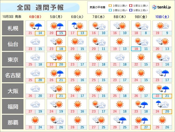 4日日曜は、全国的に雲が多く、傘の必要な所もあるでしょう。来週前半は北海道で雨や風が強まり、この雨の後は、晴れる東北から九州でも、秋めいてきそうです。