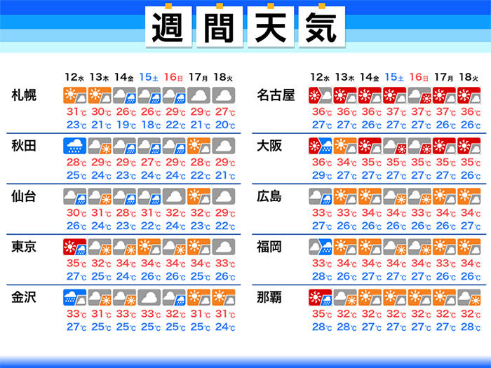 北日本は前線や低気圧が通過するため、曇りや雨となる日もありますが、太平洋高気圧が勢力を強める西日本や東日本では晴れる所が多くなります。 局地的には体温を上回るほどの危険な暑さとなるおそれがあります。長時間炎天下で過ごすことはなるべく避け、屋内であっても意識的に水分を摂ったり冷房を使うなど、熱中症対策をとるようにしてください。