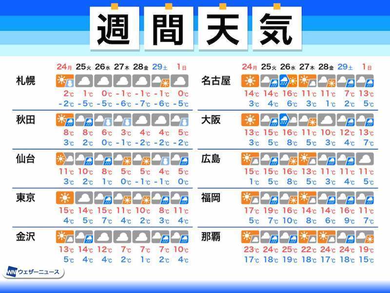 三連休最終日の2月24日(月)は、広範囲でお出かけを楽しめる天気となります。ただ好天は長続きせず、この先一週間は数日おきに天気が崩れる予想です。