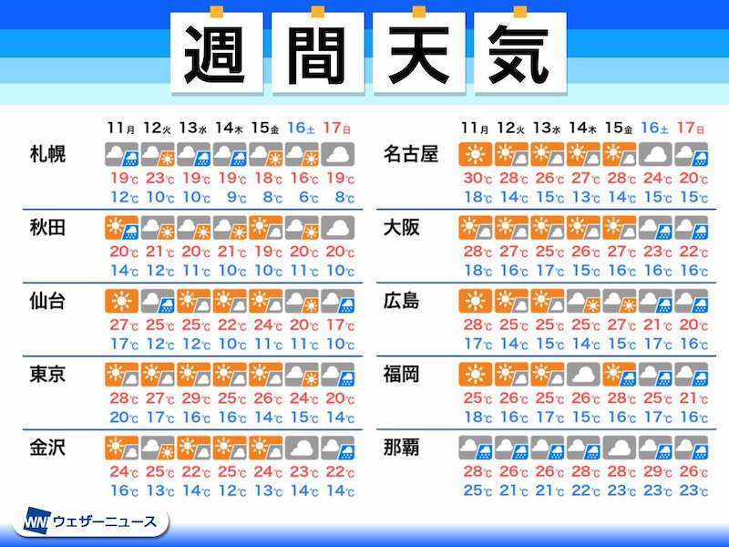 15日(金)頃にかけては気温が高めで、13日(水)は東京でも29℃予想と真夏日近くまで気温が上がる日もありそうです。