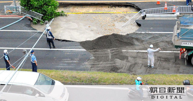 現場近くのマンションに住む50代女性は午後4時半ごろ、買い物に行こうと家を出たところで陥没に気がついた。音などは聞こえなかったという。「10年くらい住んでいるけど、こんなことはなかったのでびっくりした。『もし穴に落ちたら』と思うと怖い」と話した。(林知聡、林瞬、黒田陸離)