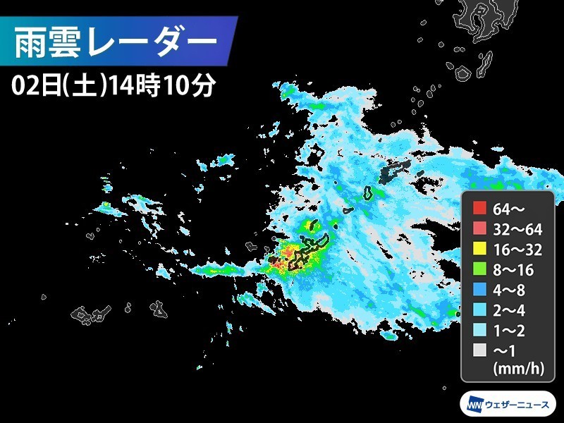 湿った暖かな空気が前線に向かって流れ込んている影響で、沖縄本島周辺で雨雲が発達しています。14時20分までの1時間に那覇で34.0mm、渡嘉敷で60.0mmの激しい雨を観測しました。