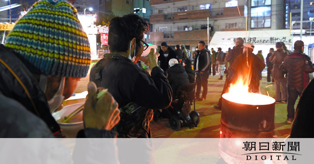 釜ケ崎日雇労働組合などでつくる「釜ケ崎越冬闘争実行委員会」が毎年行い、今年で52回目。萩之茶屋南公園(通称・三角公園)では、ボランティアの大学生らが、用意された300食分のおにぎりや豚汁を配り、約100人が受け取った。