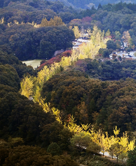 約3キロ続く「スカイロード」の両側に、黄葉した約500本が並ぶ。秩父路上空から見ると、蛇行する「黄色い道」が深緑の中で映えていた。