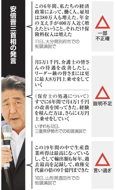参院選は政権運営のありようや政策の達成度に評価を下す機会だ。安倍晋三首相は全国各地での街頭演説で、様々な数字を示して政権の「実績」を強調している。とりわけ繰り返している数字を検証してみた。