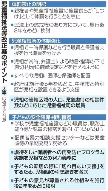 児童虐待の防止強化に向けた児童福祉法等改正案の修正で与野党が合意し、今国会で成立することになった。児童相談所の体制強化のための項目などが追加された一方、野党が見直しを求めていた体罰禁止の表現などは政府案のままで決着した。虐待を防ぐ力を強めることはできるのか。▼社会面=現場の葛藤と悲鳴