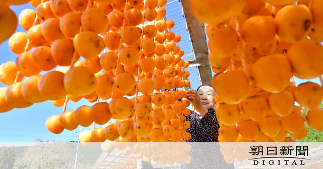 和歌山県かつらぎ町で正月の鏡餅の飾りに使われる「串柿」作りがピークを迎えている。青空を背景にオレンジの柿が並び、人々の目を楽しませている。