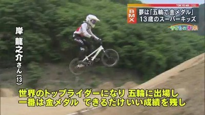 あどけない笑顔が印象的な中学1年のBMXライダー・岸龍之介選手は、クラスの人気者です。しかしそんな彼がひとたび競技に臨むと、果敢な攻めの姿勢でコースに挑みます。