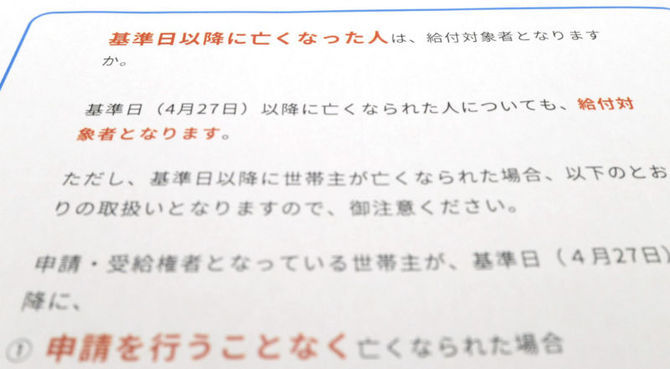 不公平をなくそうと取り組む自治体もある。長崎県大村市は11日、基準日に市内に居住していた単身世帯については、申請書類の発送前に死亡しても遺族に10万円を支給すると発表した。 社会保障に詳しい北九州市立大大学院の工藤一成教授は「自治体の事務処理の都合によって支給の有無にばらつきがあるのは問題だ。例えば基準日に沿ったシンプルな給付にするなど、国は制度設計を見直すべきだ」と指摘する。(古長寛人)
