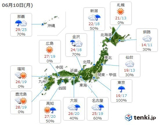 きょう10日(月)の本州付近は、日本の南の低気圧や湿った空気の影響を受けます。このため、広く大気の状態が不安定に。また、沖縄は梅雨前線の影響で大雨となるおそれがあります。