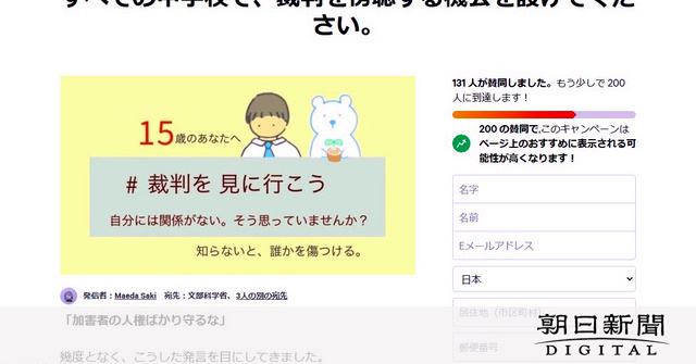 東京都内に住む大学生が、すべての中学校で裁判を傍聴する機会を設けることを呼びかけるオンライン署名を始めた。原点にあるのが、自身が15歳の時の体験だ。
