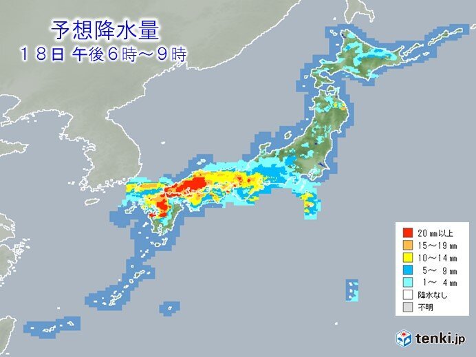 中国、近畿、東海 120ミリ あす(19日)の朝からあさって(20日)の朝にかけて、四国や東海は多い所で50~100ミリの雨が予想されています。