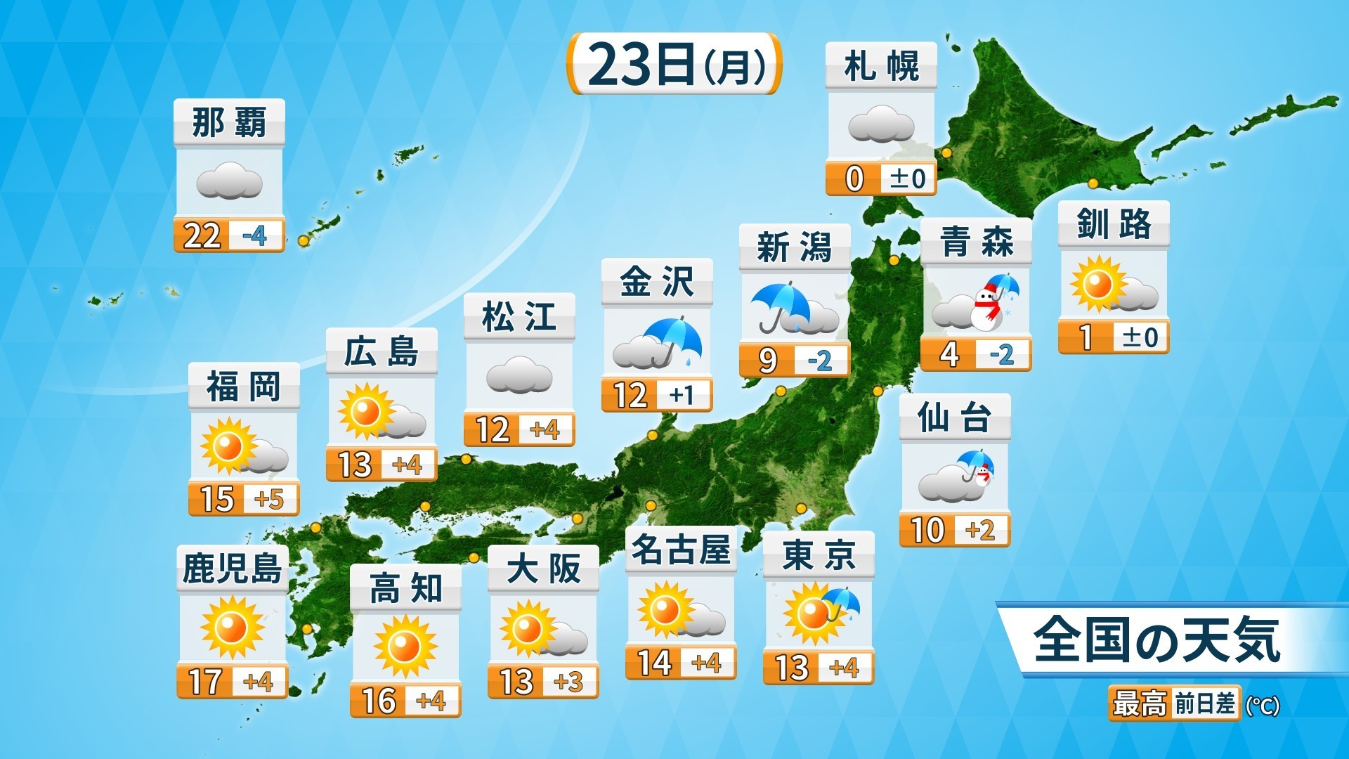 きょう23日(月)は太平洋側では天気が回復し、晴れる所が多くなる。一方、日本海側の地域はスッキリしない空模様で、北陸や東北では断続的に雨や雪となりそうだ。