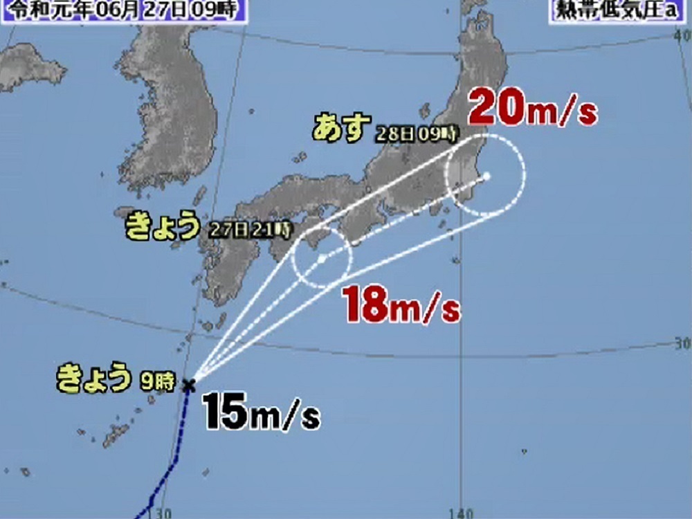 熱帯低気圧は27日午前9時現在、奄美大島の東の海上を北北東に進んでいて、27日夜遅くから28日明け方にかけ東海地方にかなり接近し、今後24時間以内に台風になる見通しです。