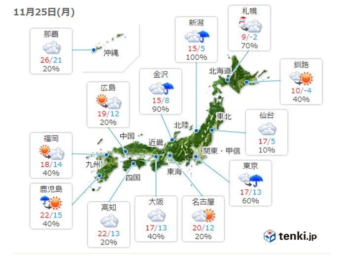 きょう(25日)は広い範囲で雨が降り、次第に北よりの冷たい風が吹くでしょう。午後はどんどん気温が下がり、朝よりも寒く感じられそうです。