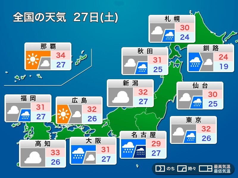 27日(土)は、台風6号が北上してくるため、近畿から関東にかけて、太平洋側を中心に傘の出番となります。