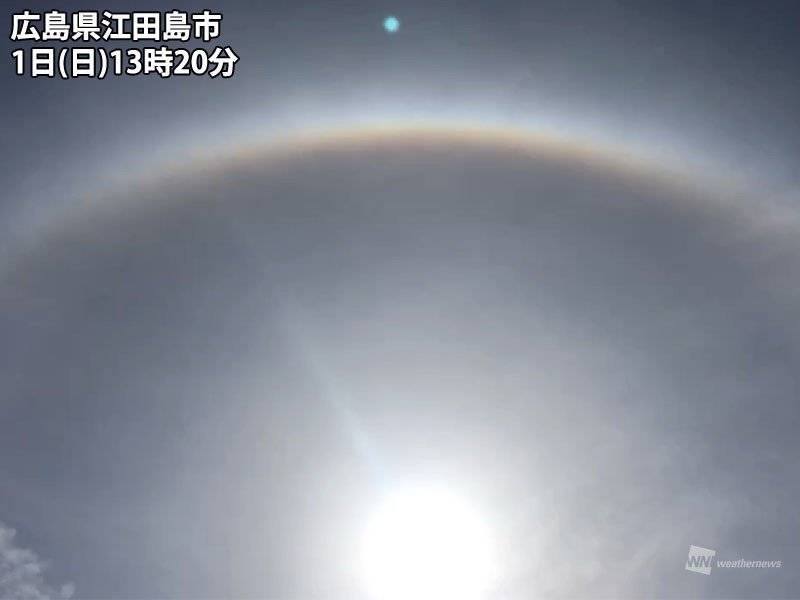 穏やかな3月スタートとなっている関東から中国地方の一部で、ハロやアークなどの虹色現象が出現しています。広島県江田島市で見られたのは、上部タンジェントアーク。太陽の中心から上方22度付近に現れ、ハロに比べて虹色がはっきり見えるのが特徴です。