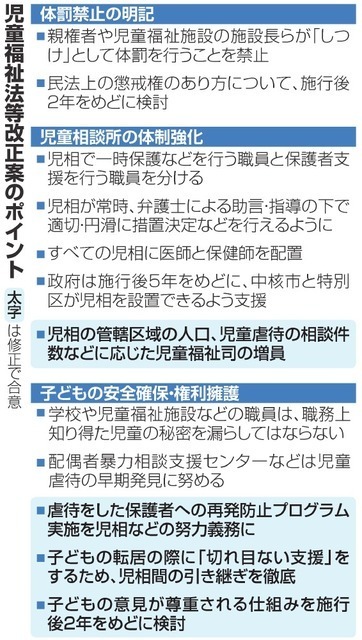 児童虐待の防止強化に向けた児童福祉法等改正案の修正で与野党が合意し、今国会で成立することになった。児童相談所の体制強化のための項目などが追加された一方、野党が見直しを求めていた体罰禁止の表現などは政府案のままで決着した。虐待を防ぐ力を強めることはできるのか。▼社会面=現場の葛藤と悲鳴