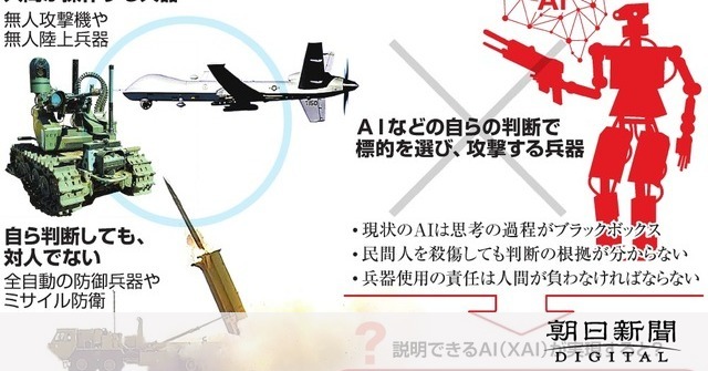 米国防総省も、攻撃判断は人間が関与するよう内規で定めている。ただ、米同時多発テロ後、米国がアフガニスタンでミサイル攻撃や仕掛け爆弾の除去に無人機やロボットを多用する時代に入り、画像認識技術などAIをこれらに組み込む流れが生まれた。日本も、完全自律型の兵器は開発しないとしつつ、AIは「ヒューマンエラーの減少や省力化に意義がある」と期待する。