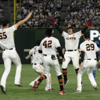 The Kyojin had to wait an extra inning to taste victory, but that did not dampen the celebration after Shinnosuke Shigenobu raced home on Kazuma Okamoto’s sayonara double in the 10th inning to give the team a 3-2 win over the Hokkaido Nippon Ham Fighters at Tokyo Dome.