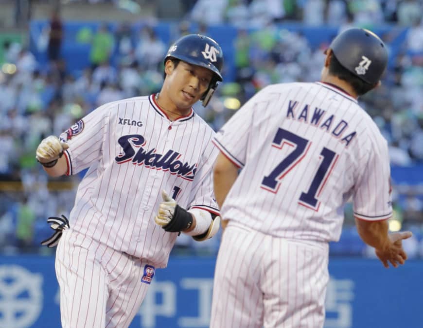 With their offense clicking into gear from the outset, the last-place Swallows racked up 17 hits, including four home runs, at a hot and humid Jingu Stadium.