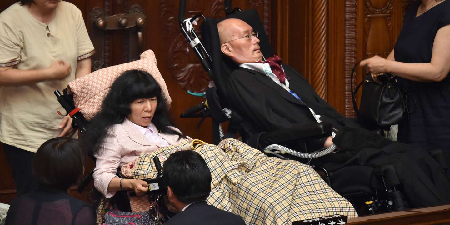 vidéo Lourdement handicapés, Yasuhiko Funago et Eiko Kimura ont fait leur entrée au Parlement japonais. Leur but : porter la voix de tous leurs concitoyens en situation de handicap.